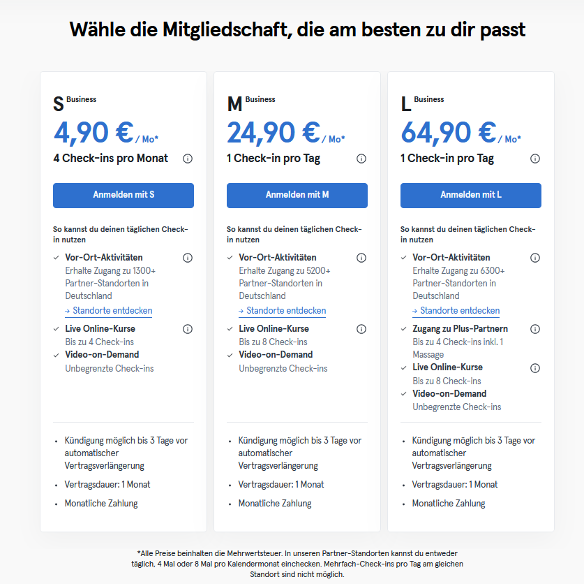 Bitte meldet euch mit eurer Firmen-E-Mail-Adresse an. Die Anmeldung ist bis zum 20. eines Monats möglich, um zum 1. des Folgemonats starten zu können.